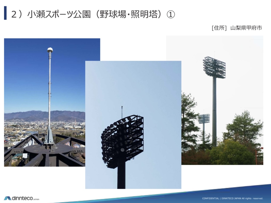 山梨県の小瀬スポーツ公園では、従来型の避雷針が付いていたが、2~3年に一度は落雷の被害に遭っていた。そこで、2021年に陸上競技場、サッカースタジアム、プールや武道館、照明塔など、30ヶ所にあった避雷針を「dinnteco」へ変更した。取り替えてから現在まで一度も落雷はない。