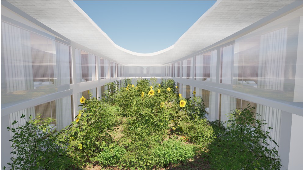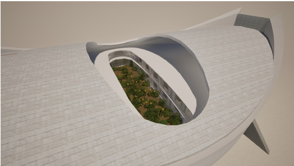「つり屋根の中央に穴をあけて光庭を設けます。これにより、建物は軽量化され、耐震性を確保しやすくなるとともに、各客室に採光をもたらします」(青木氏)