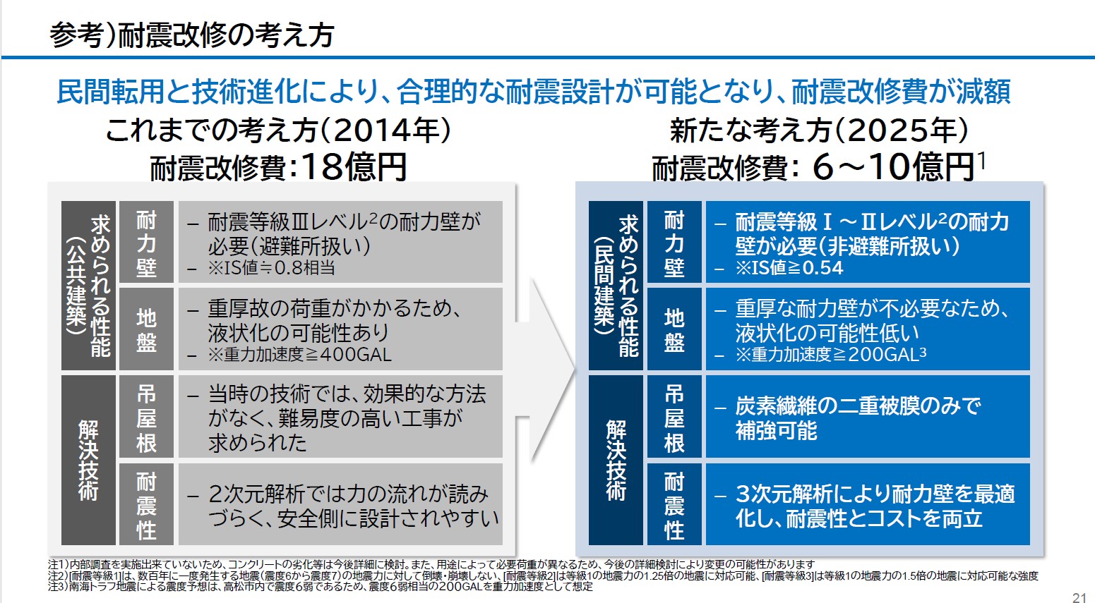 耐震改修の入札を行った2014年当時には費用は約18億円とされていた。しかしこの度、同委員会は構造設計者とも議論を行い、県現在の技術を使えば耐震改修費用は6~10億円で済むと試算している。劣化が取りざたされたつり屋根は、炭素繊維で補強し、追加すべき耐震壁は2014年時点の案よりも減らせるという。