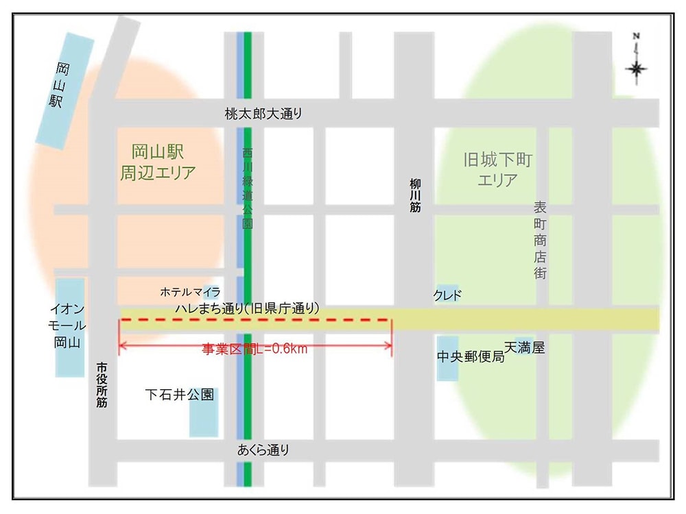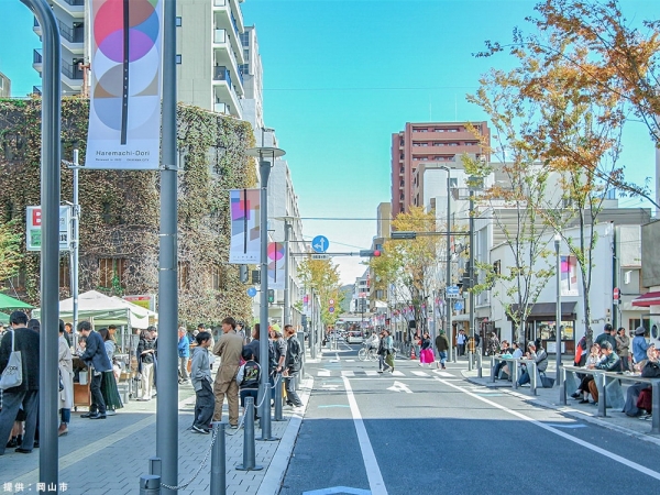 そして、2020年1月にいよいよ再整備工事が始まる。2022年3月に再整備工事が完成。さらに再整備区間の道路愛称を新たに定めることになり、名称を公募した。応募数は391件あり、同年10月にその中から「ハレまち通り」に愛称が決定。岡山県の別名「晴れの国」に由来する名前だ。