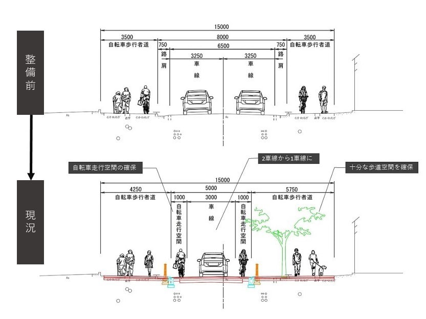 そこで市役所は、1車線化の実証実験を行い、渋滞等の影響はほとんどないことを確認。業務車両の停車場所の問題は、再整備区間内に適宜停車するスペースを確保することにした。また、職員が沿道の関係者全員を回り、丁寧に説明をしていき、理解を得ていったという。地道な活動により、少しずつ反対を解消していったのだ。