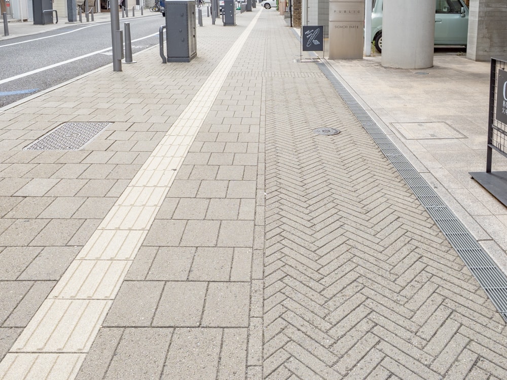 老朽化でボコボコになった路面タイルは、きれいなものに新調され、歩きやすくなった。1mの占用区間と、歩行区間でタイルのデザインを変え、占用区間を分かりやすくする工夫もしている。