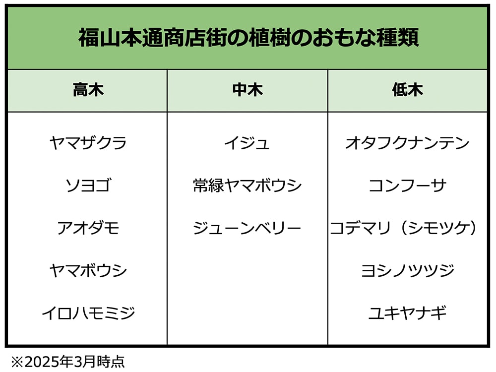 なおリニューアル後、商店街の店主らによりグリーンパトロール隊を組織して植樹の維持・管理をしてきた。その後、商店街の個々の店が店頭の植樹を維持・管理をするシステムに移行。より効率的な管理方法を取り入れている。2025年には「みどりのお手入れガイドブック」を製作し、関係者に配布。知識やノウハウがなくても、植樹の手入れがしやくすなる工夫を取り入れている。