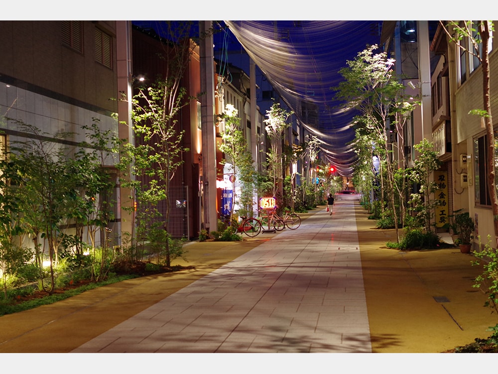 植樹が終わったあとに、両方のライトを取り付けて実験してみたところ、ダウンライトに照らされて木々の影が路面に投影される景観が美しかったことが決め手になり、ダウンライトの採用が決定する。