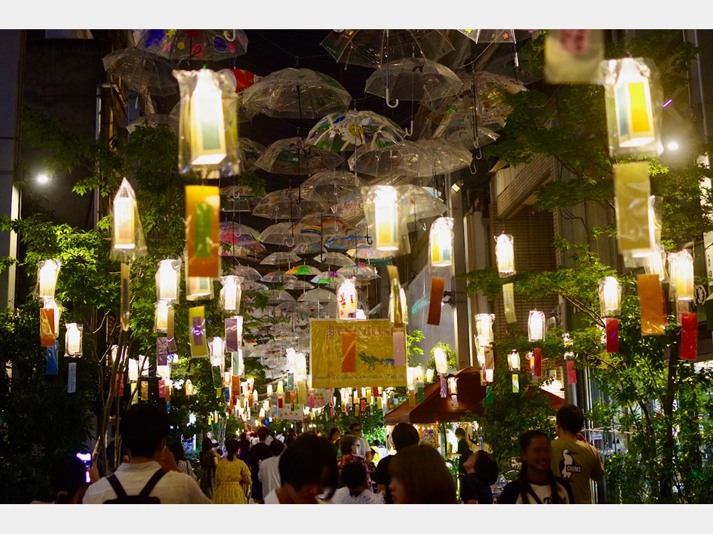 特に代表的なイベントが、改修前から毎年開催されている「とおり町七夕まつり」。改修前はアーケードを開放して行う、風船飛ばしが人気だった。改修でワイヤー型のアーケードになったことで、新たに「アンブレラナイト」を実施。これは前田さんが考案したもので、いろとりどりの傘をたくさんワイヤー型のアーケードに吊るすもの。本通商店街のイベントで、もっとも人が集まるという。