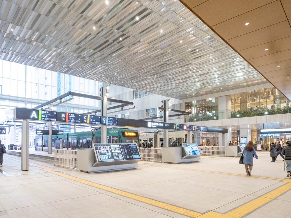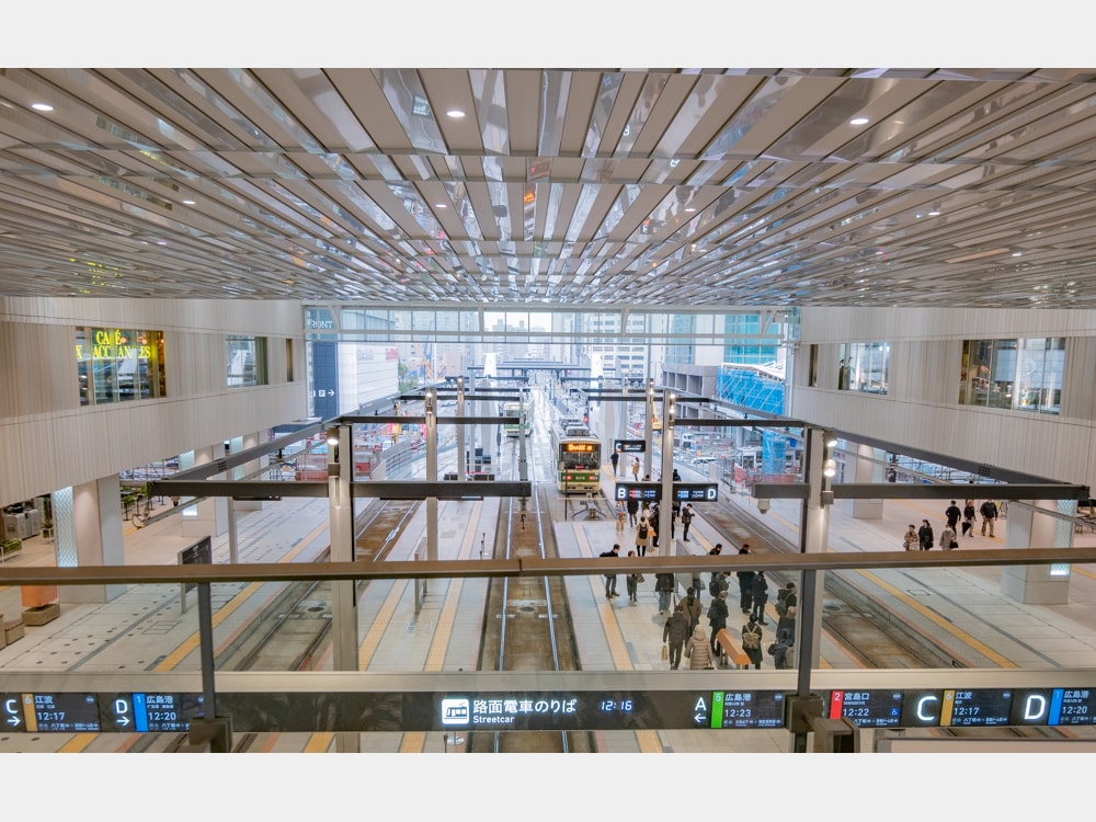 なお、路面電車停留場のある中央アトリウム空間は「エキ×デン スクエア」という名称が付けられている。広島駅と駅ビル、そして路面電車が交わる空間という意味だという。
