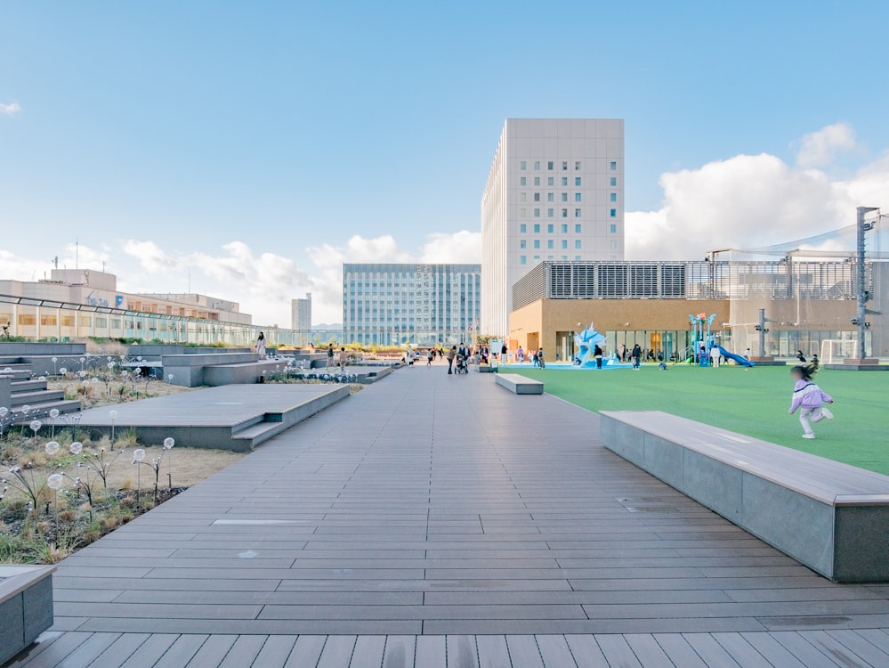 「注目してほしいポイントは、3階に設置している『雁木(がんぎ)テラス』と7階の『ウッドデッキ広場』です。雁木テラスは、広島を流れる川にある雁木をイメージしています。エキ×デンスクエアを見下ろせる場所で、路面電車が行き交うダイナミックな様子が眺められるのが魅力です」