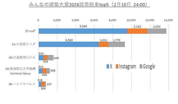 X(旧twitter)、InstagramとGoogleフォームの3つのプラットフォームにおいて、「null2」がいずれも最多の得票を集め、みんなの建築大賞に決まりました。また大屋根リングは、候補となる10作品に絞る際、推薦委員からもっとも多く挙げられていたことから、推薦委員会ベスト1となりました」と大賞と推薦委員会ベスト1についてコメントした。