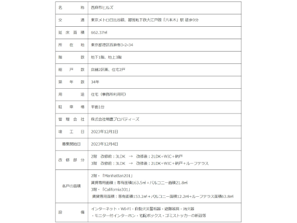 2階は「Manhattan(マンハッタン)」と名付け、ニューヨーク・マンハッタンの摩天楼ビルの1室をコンセプトとしたコンクリート打ち放し仕上げの高天井(有効高2,860mm)に、3階は「California(カリフォルニア)」と名付け、カリフォルニアの開放感ある邸宅をコンセプトに、ルーフテラスで眺望を満喫できるデザインとなっている。また、ルーフテラスからは、近望の六本木ヒルズから遠望の富士山までの景色を楽しめる。設備面では、建物全体を事前に点検したうえで、電気・設備の必要対応工事を実施。快適な都心生活を提供するため、共用玄関へのセキュリティー設備・モニター付インターホン・宅配ボックス・ゴミストッカーの新設等、物件に相応しい設備を加えた。