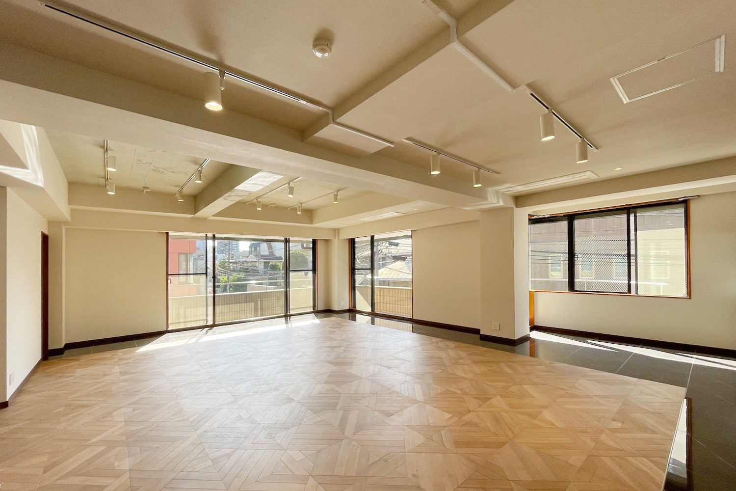 本物件の一押しポイントは、玄関を開けて目の前に広がる、約40帖の広々としたリビングダイニングです。ホームパーティーを開いたり、トレーニング器具を置いてプライベートな時間を楽しむなど、ライフスタイルの選択肢が広がる空間となっています。