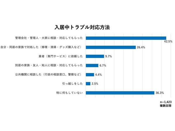 入居中トラブルの対応方法については、「管理会社・管理人・大家に対応してもらった」が42.5%で最も多い結果となりました。次いで、「特に何もしていない」が36.3%、「自分・同居の家族で対処した(修理・清掃・グッズ購入など)」が26.4%、「業者(専門サービス)に依頼した」が9.7%となっています。