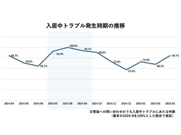 実際、2024年4月から2025年3月までの1年間に全国の大家・入居者・管理会社から日管協にあった問い合わせのうち、賃貸住宅の入居中トラブルに関する問い合わせの件数を集計したところ、最も多かったのは2024年の8月でした。7月・9月も相対的に件数が高く、夏場は入居中のトラブルが増える時期だと言えます。