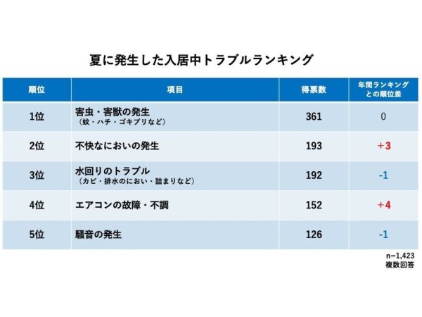 夏に発生した「入居中トラブル」ランキングー最多は「害虫・害獣の発生」、特に夏に増えるのは「不快なにおい」と「エアコンの故障」
