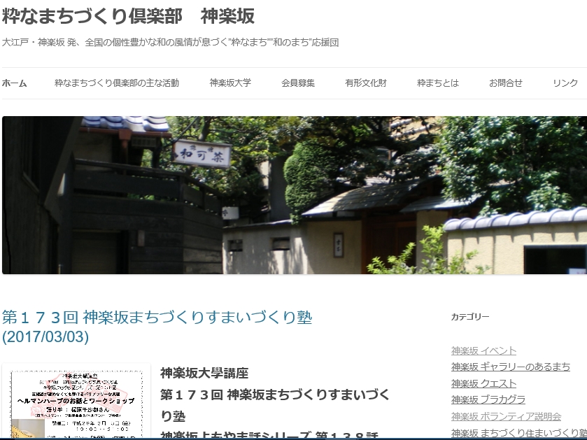 「楽しくまちづくりをしよう」との考えで活動しているのが、「まちづくりすまいづくり塾」。神楽坂に関わる方を講師に招き、色々な話を聞くというもので、原則毎月第一金曜日夜に開催。170回以上も続いている人気のイベントで、「神楽坂よもやま話シリーズ」「神楽坂匠シリーズ」「今あらためて! 神楽坂まちづくりシリーズ」などの興味深い話を誰でも参加して聞くことができる。