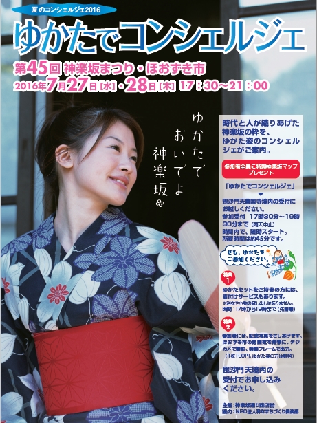 観光・まちづくり活動としては、毎年7月の神楽坂まつりのほおずき市に合わせて行われる「ゆかたでコンシェルジュ」が代表的。浴衣の着付けサービス、浴衣でのまち案内などが人気を博している。