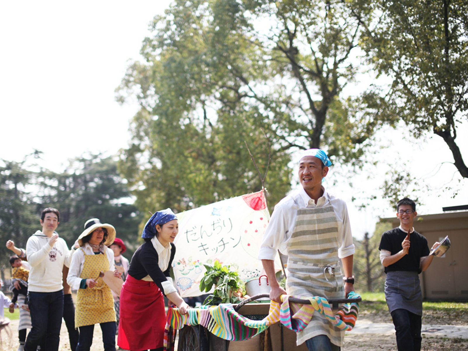 「泉北をつむぐまちとわたしプロジェクト」活動の初年度は、まち全体をひとつの家に見立てて食堂・庭・居間・廊下・玄関、チームに分かれ、さまざまな企画を創出・実施した。たとえば食堂チームは、「だんぢりキッチン」を提案&実施。横と縦の関係がしっかり結びついている、だんじり組織を見習いたいとの思いがこもったネーミングで、リヤカーをだんじりに見立てて食材を運び、公園でカレーやスープを作り、みんなで食べる企画だ。