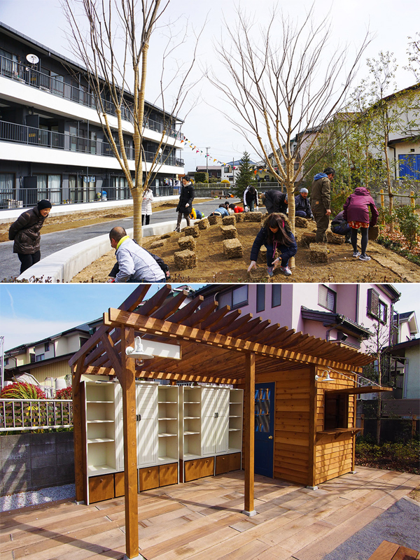 (写真上)入居者と地域住民によるコモンガーデンのワークショップの様子。当日は、小さな子どもから高齢者まで幅広い世代が参加したという(写真下)まちライブラリが設置されている小屋。オーナーと地域住民がDIYで作り上げたもので、製作期間は約1週間だったという