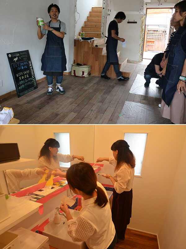 オープン前には入居希望者を集め、同物件のリノベーションを手掛けたプロを講師に、黒板ボードを制作。入居後には、共有スペースである洗面台にタイルを張るワークショップを開催し、入居者とスタッフが参加するなど、DIYをテーマにした物件らしいイベントで幕を開けた。