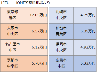 札幌で賃貸物件を探すと、敷金0又は1ヶ月、礼金0ヶ月であるところが多く目につく。新築物件でもそのような物件を見つけることができたりする。また、札幌市中央区の家賃相場を見てみると1K/1DKでも平均4.29万円ほど。大都市である東京都や大阪市、名古屋市の中枢区と比べると大きく家賃相場に差が出ていることがわかる。さらに、京都市、仙台市、福岡市、広島市など札幌市よりも人口が少ない地方都市と比較しても、札幌の家賃は低いと言えそうだ。