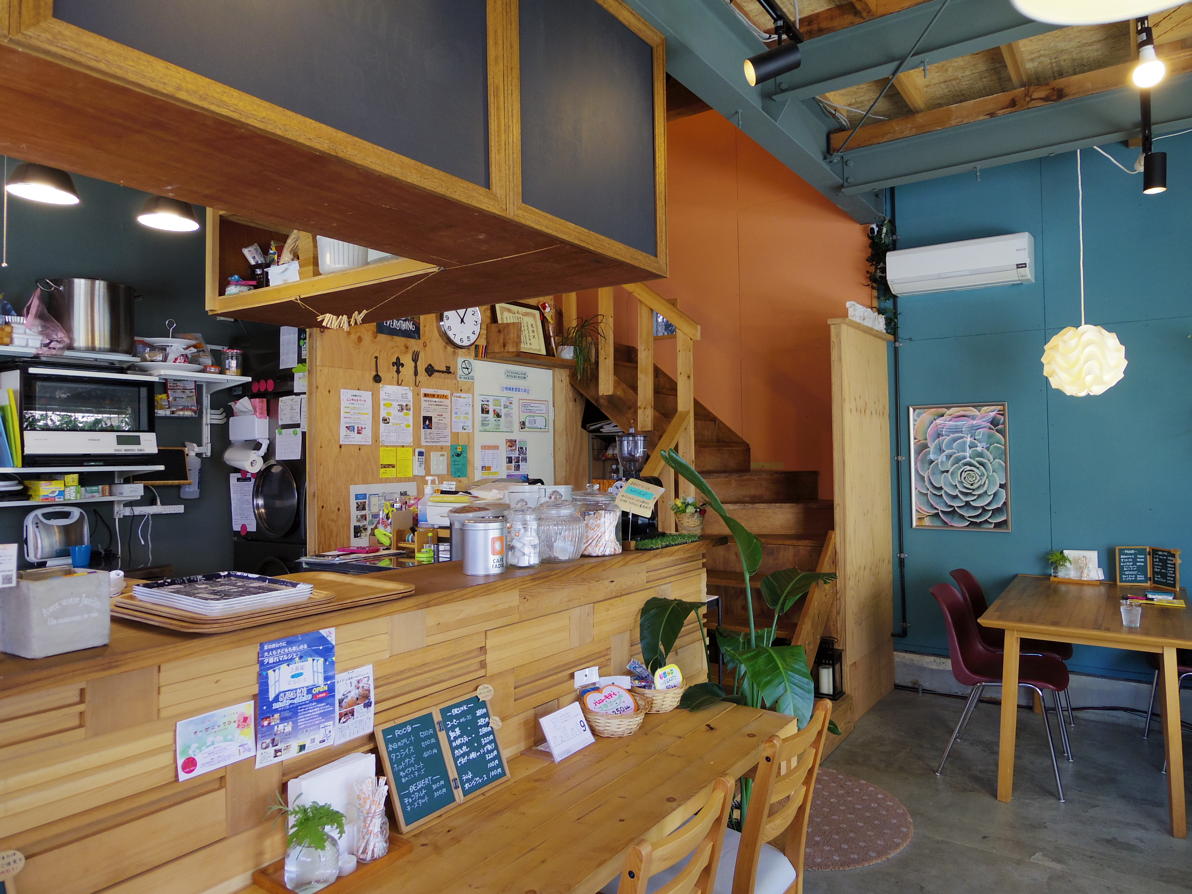 古いアパートの一部が明るい黄色で塗装され、軒には「レンタルスペース&カフェ」の文字。レトロ感のある扉を開けると、テーブル・カウンター席と、奥に2階へ続く内階段がある。