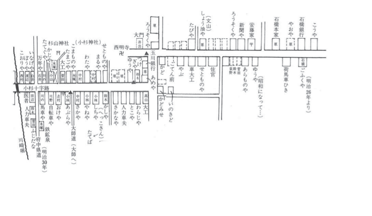 小杉十字路付近は1913年(大正2)に府中街道を溝の口—川崎間を乗り合い馬車が走り、停留所ができるなど、当時は多くの商家、劇場、銀行、宿屋、料理屋などがあり、非常に栄えており、ロンドンかパリかと言われたという。ほんまかいなと思ってしまうが、とにかくそれほどの賑わいだったらしい。