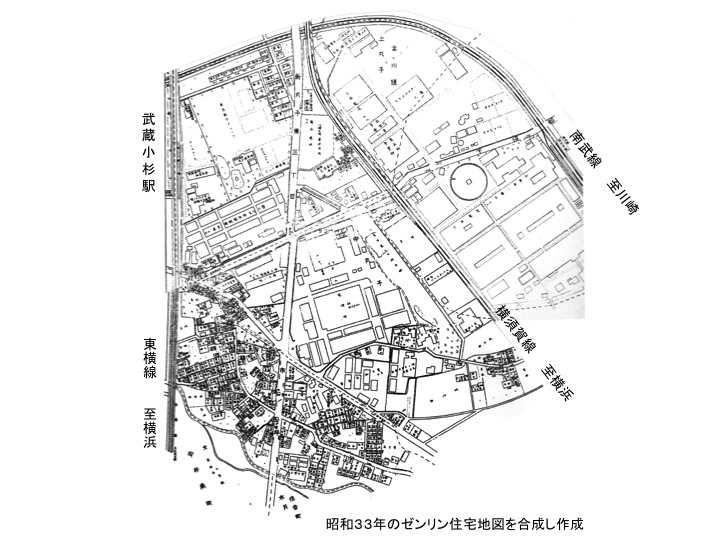 武蔵小杉駅周辺に住宅地開発が起こったのは、1926年、東急が新丸子に住宅地をつくってからである。27年に川崎—登戸間に南武線ができ、29年に先ほどの第一生命グラウンドができている。33年には小杉陣屋町にサラリーマン向けの住宅地ができた。この年、東急東横線の渋谷-桜木町間が全線開通、その後、郊外住宅地化が次第に進んだようである。