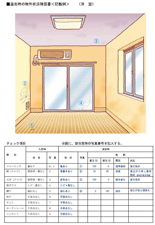 その他、入居前に行っておきたい点としては、入居前から存在する傷や汚れの確認だ。入居時と退去時の状況を比較できるように、貸主と借主の立ち会いの上でキズや汚れがどこにどの程度あるか確認する。その際、あやふやにならないよう、証拠として写真も撮っておき、「入居時の物件状況確認書」などの書面も作成しておくと良いだろう。ガイドブックには、この確認書の記載例も掲載されているので、併せて確認して欲しい。