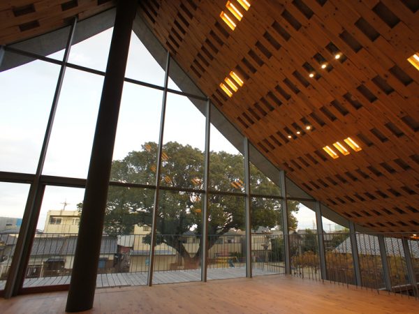 最大スパン20mもの柱のない大空間プレイエリアには、世界のあそび道具などもあり海外への関心が高まりそう。ガラス越しに広がる向かいの公園では、樹齢300年以上の楠が子ども達やカフェで憩う人々を見つめているのも微笑ましい