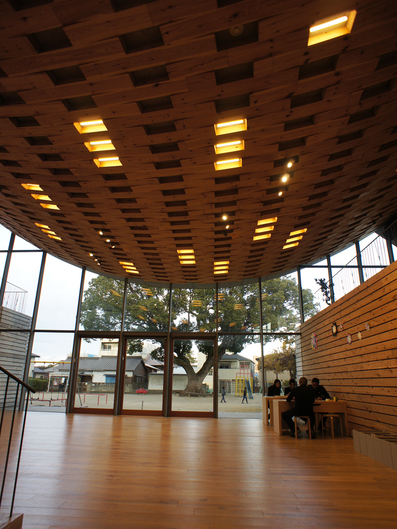 エントランスを入ると、反り上がる天井へと自然に視線が向かう。全て立体的に異なる形状の梁(アカマツ)を1369本使用し、それを編み込むようにして柔らかな曲面を描いたのだとか。湾曲する壁棚には洋書や英語の図鑑もいっぱい。その先の階段を上った広いロフトも教室として使われている江戸時代、子どもたちに読み書きやそろばんなどを教えた寺子屋。