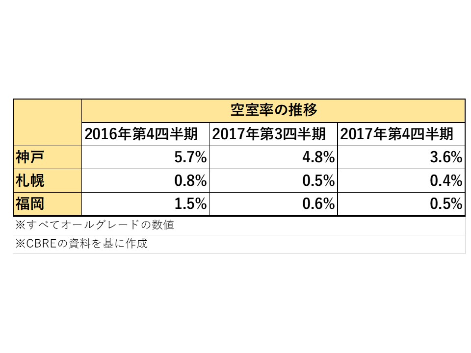 2017年第4四半期では、調査したすべての地方都市において空室率の低下が進んでいる。例えば神戸の空室率は、過去最低値を2期連続で更新した。また、想定成約賃料は、全国13都市のすべてが上昇。札幌、福岡では2期連続で対前期比プラス2%以上の上昇率となった。特に福岡の上昇率は顕著で、対前年比プラス11.1%となり、調査開始以来最高の伸び率を記録した。
