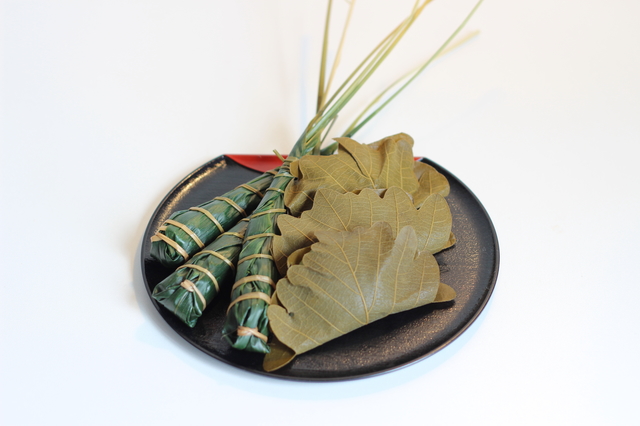 一方、柏餅が生まれたのは第九代将軍の家重の時代、江戸が発祥と言われている。柏は「譲り葉」で、新芽が出るまで古い葉が落ちないので、跡継ぎが重要な公家や武家にとって縁起の良い植物。香りも気品があり、関西でも関東でも、儀式などで使用されてきた。しかし、関西以西には柏の自生地が少なかったようで、『日本書紀』にも、仁徳天皇の后である磐姫が柏の葉を求めて船旅をした記事がある。だから関西では、柏餅があまり定着しなかったのだろう。近年には餡を包んだ団子を、サンキライなどの分厚い照り葉で包み、端午の節句に食べる風習も生まれている。