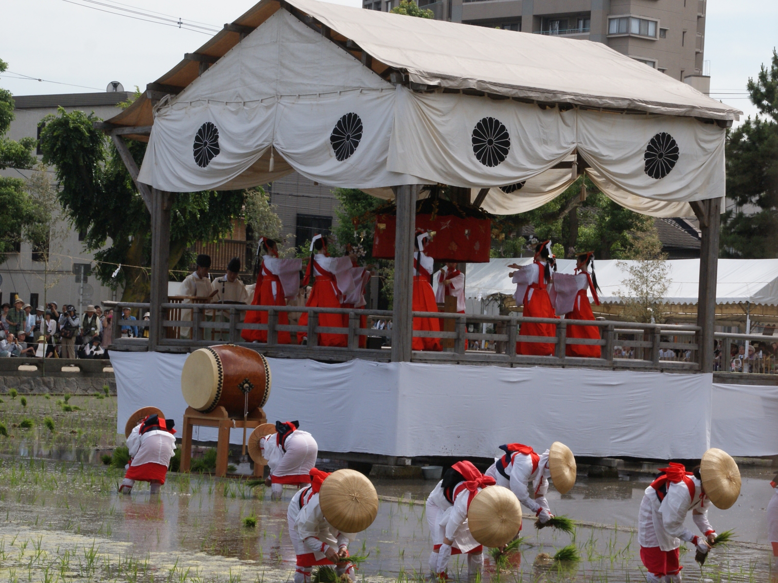 御田に辿りつくと神職が田を祓い清め、耕作長にあたる大田主(おおたぬし)が田に御神水を注いでから、「斎牛(さいぎゅう)」と呼ばれる神聖な牛が、御田の代掻きを奉仕、そこでやっと植女と替植女たちによる田植えが始まる。田植え開始とほぼ同時に、御田の真ん中に組まれた櫓の上では、住吉大社の神楽女8人で構成される「八乙女」たちによる田舞が、次いで御稔女による龍神の舞が舞われる。そして畔では侍大将に扮した男たちが表裏金銀、日の丸の軍扇をかかげ、月明りに見立てて威武を示す「風流」の所作を行い、紅白の雑兵たちが棒打合戦の演技をする。棒を打ち鳴らすのは、田んぼから害虫を追い出す「虫追い」の意味もあるのだとか。そして地元小学生の少女たちが扮する早乙女により、往古から農民の間で謡い継がれてきた田植歌と田植え踊りが奉仕される。