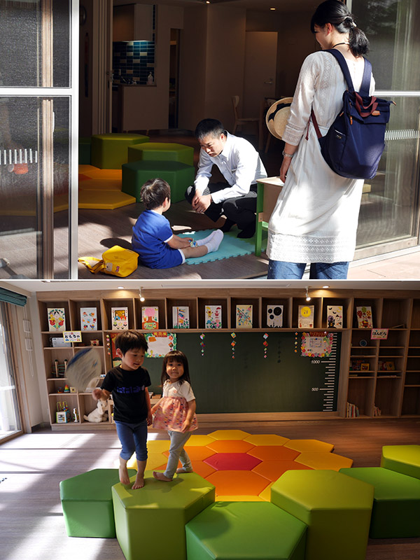 <上>保育園から帰ってすぐに、中庭からキッズスペースに立ち寄った男の子。中央の男性が萬富の仲渡孝雄さん。子どもたちや親御さんから「なかとさん、なかとさん」と呼ばれ親しまれている<下>広々としたキッズスペースで走り回って遊ぶ子どもたち