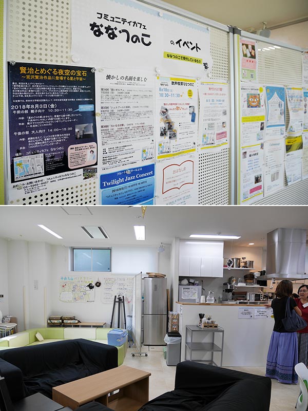 <画像上>コミュニティカフェななつのこの情報ステーション。地域情報やイベント告知が掲示。絵本の読み聞かせ会や、世田谷区地域子育て支援コーディネーターに相談できる出張ぷちぶりっじなどさまざまなイベントが開催されている<画像下>ななつのこカフェスペース