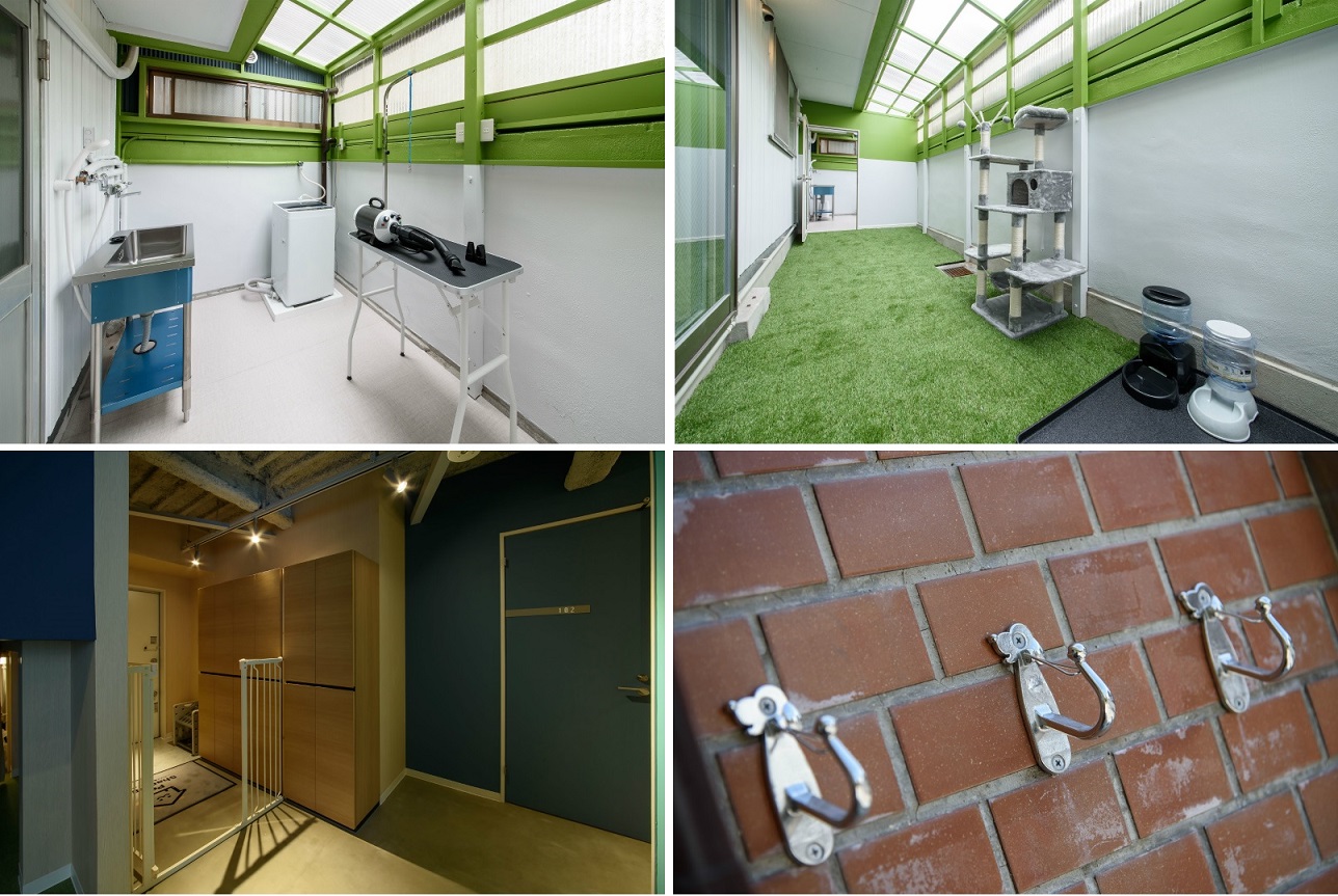 居室のある2階と3階それぞれに温水洗浄便座、シャワールーム、浴室(2階のみ)、洗面室、洗濯機、乾燥機を完備。そして1階は共用キッチンと台所のほか、ここの大きな特徴となる、ペットの手入れができるグルーミングルームとペット用のプレイルームを備える。