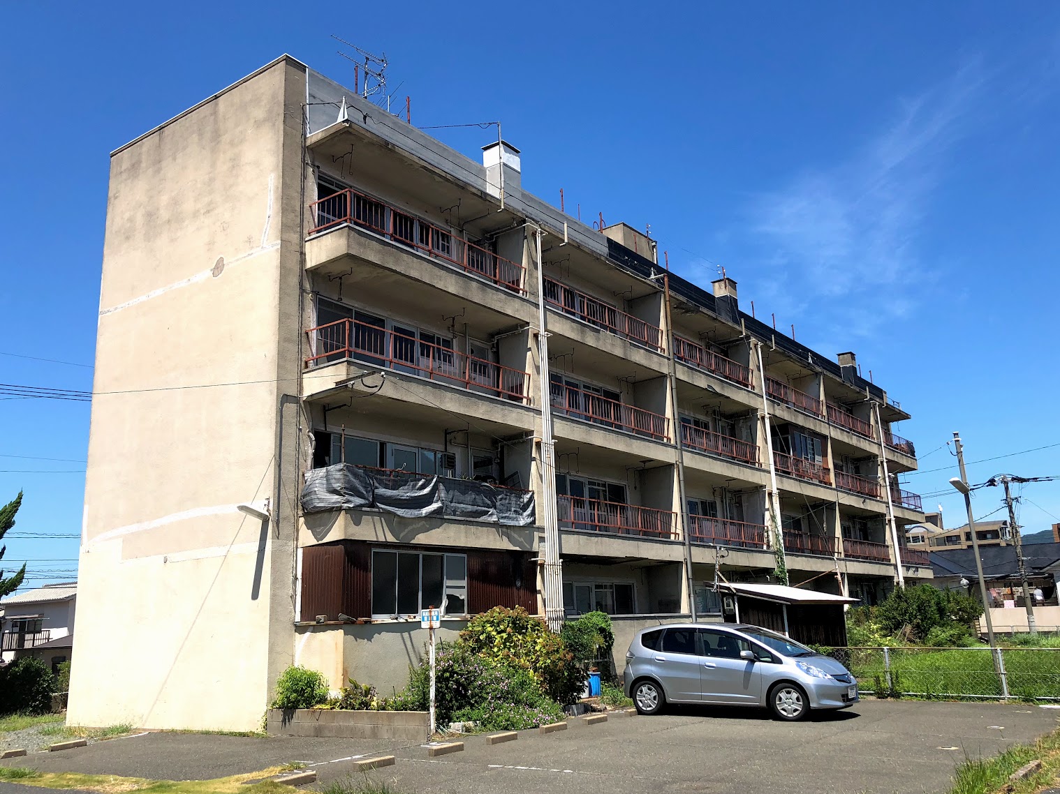 最近まで人が住んでいた馬寄団地に甚だしい損傷はないが、よく見ると窓まわりなどあちこちに補修の痕跡がある。南側に回ってみると、ベランダの手すりも傷みが激しい。