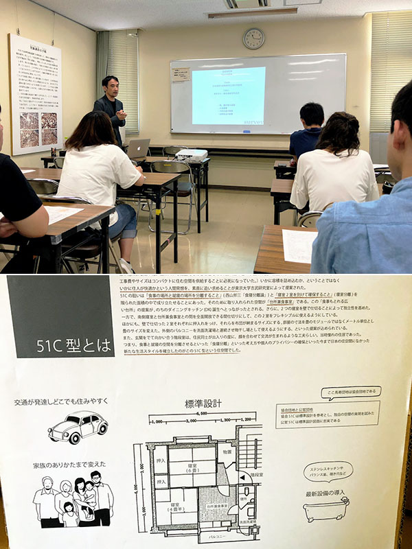 (上)現地見学会と同日に開催されたセミナーで講義する福山秀親教授(下)学生の展示による「51C」の説明。51Cは今でいう「2DK」。約35m2の床面積の中で“食寝分離”と“寝室分解”を両立させるために台所と食事室を兼ねた。これが「ダイニングキッチン」の始まりとなった馬寄団地が誕生した1954年は戦後復興のただ中で、大量の住宅供給が必要とされていた時期だ。そのために当時の建設省が主導してつくった公営住宅の標準設計のひとつが「51C型」である。馬寄団地の間取りも、この「51C型」を踏まえてつくられた。