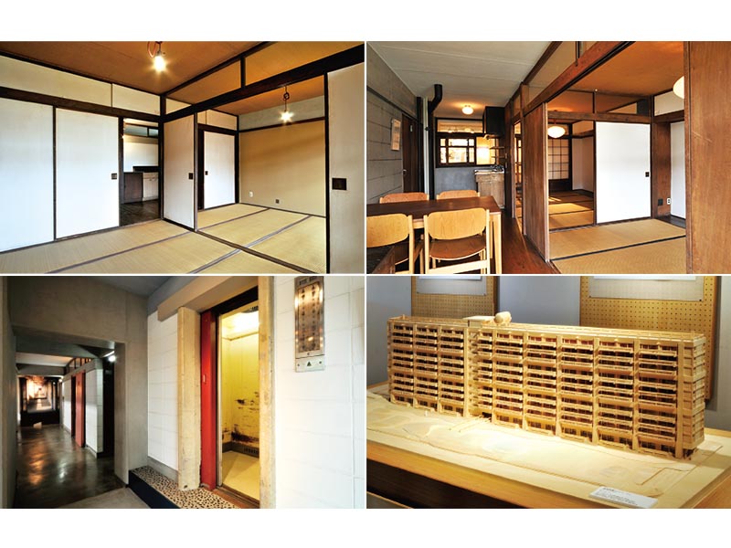 展示されている世帯住戸は2DKタイプで、土間形式の台所の横の部屋は茶の間として、もうひとつの部屋は主室として設計されている。台所には流し台・コンロ台と調理台に米櫃と炭櫃が備え付けられており、ダストシュートも設けられた。トイレは和式だが水洗式である。