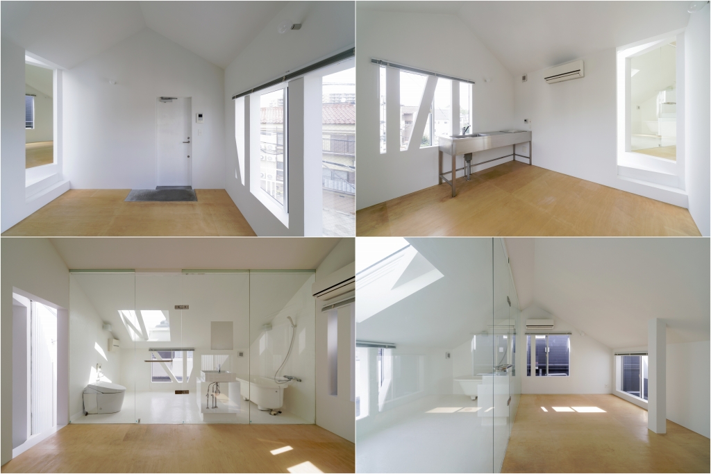 もう1室は2階にある、LDKともう1室が斜めに段差をもって繋がった変形な部屋。しかも、部屋の面積の半分ほどがガラスで仕切られ、水回りになっている。屋根の天窓からは燦々と陽光が降り注ぎ、ここで昼間に入浴したらさぞかし気持ちの良いことだろう。