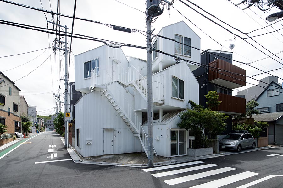 「東京アパートメント」は2010年に建築好きのオーナーが所有していた土地を利用し、建築家・藤本壮介氏に依頼して建てた自宅+3戸の賃貸住宅からなる建物である。板橋区のごく一般的な住宅街に立地しており、四角い箱に三角の屋根という、多くの人が思い浮かべるであろう家の形をした部屋が5つ、少しずつずらして重ねたような外観が人目を引く。