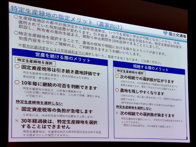 特定生産緑地制度について、都市農地の保全や、コンパクトシティ政策実現の観点から、今後は地方都市での導入が必要と一言氏。生産緑地制度によって、固定資産税などの特例措置を受けられることが農家の経営を安定させ、都市農地の保全につながると指摘している。