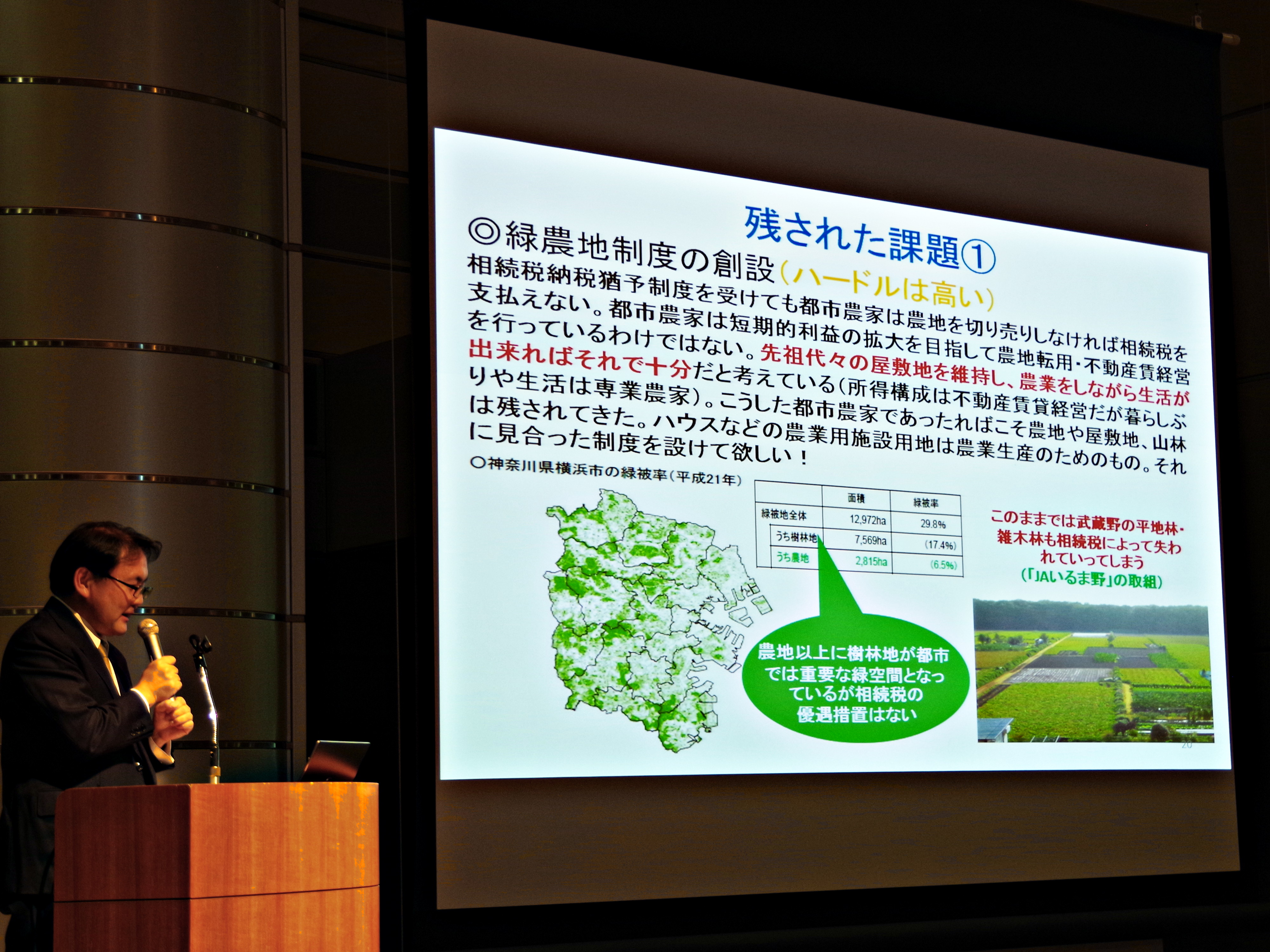 最後に、安藤教授は、神奈川県秦野市で農家を対象に行ったアンケート調査の結果を紹介。「土地利用制限期間が10年程度に緩和されたら指定を受けるか」や「相続税納税猶予適応農地の貸借を認める制度改正をどう思うか」などの設問について、後継者がいる人は制度改正を望む割合が高く、後継者がいないと関心が低い結果になっていた。安藤教授は、「せっかくの制度改正も、後継者がいなければムダに終わる」と、後継者作りの必要を訴えるとともに、農業収入で生活できる自立経営の育成を都市農業政策の基本にするべきと提案して締めくくった。