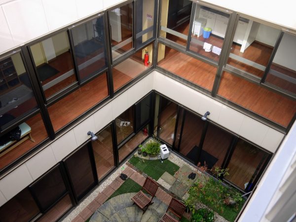 現在稼働中の生活支援付き賃貸住宅「プラザ抱樸」は鉄筋コンクリート12階建ての大型マンションで、110室中60室を抱樸が借り上げている。個々は独立した住まいでありつつ、一棟にまとまっているので、支援スタッフもこまめに訪問でき、常駐の管理人による24時間の見守りが可能になった。