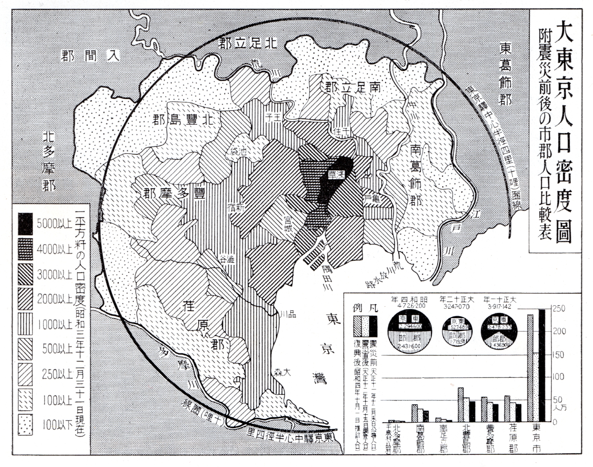 また下谷区12.8万人から18.3万人、芝区13.5万人から17.9万人、本所区13.7万人から25.6万人、深川区11万人から18.1万人と、都心周辺の第二下町で人口が増加した。