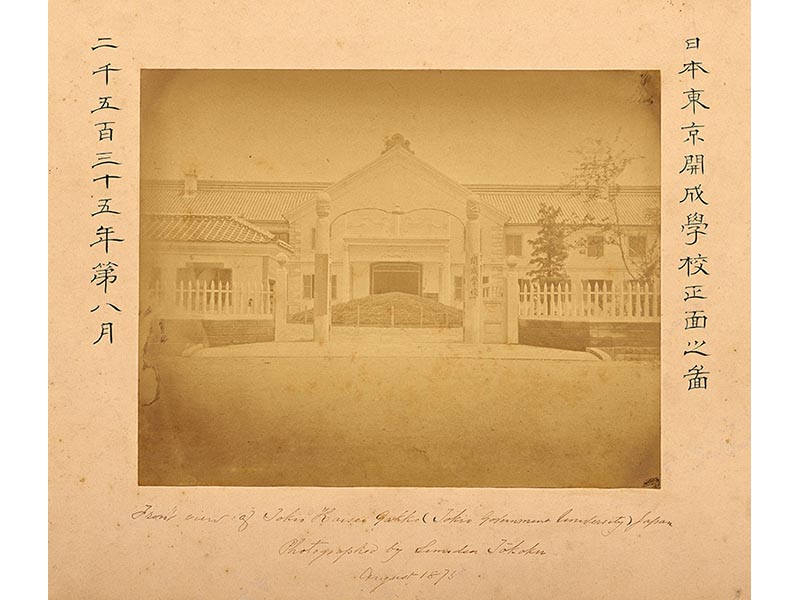 下のセピア色の写真は開校間もない明治8(1875)年の「東京開成学校」の正門と本館。皇紀で「2535年第8月」と記されている。