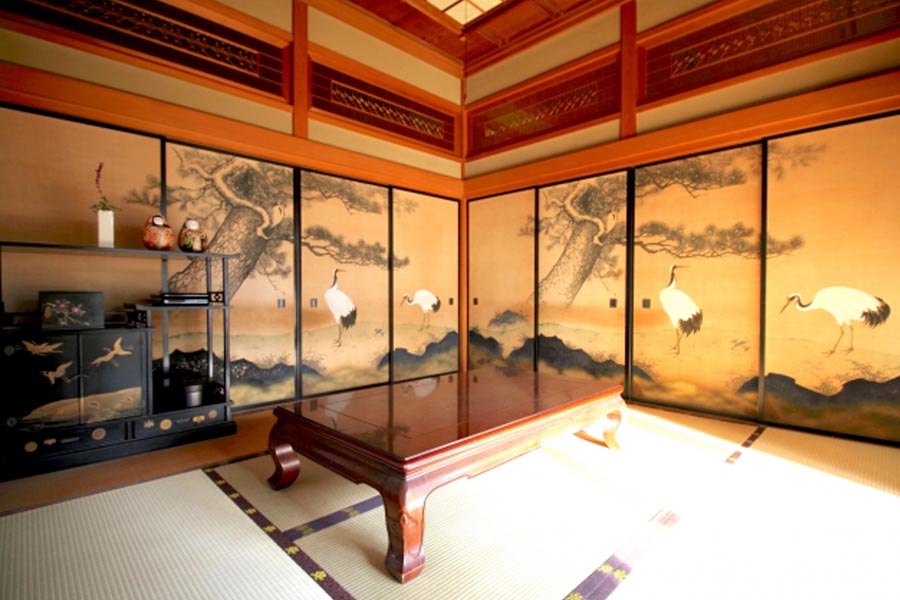 広い⽞関に足を踏み入れると、天然⽯が鎮座する、威厳のある⾼い上がり框が待ち受けている。屋内は、天井⾼3mの居室が特徴的だ。⼀続きとしても使える書院造りの4部屋の和室、欄間をはじめ組⼦が随所にあしらわれた建具、存在感ある桁丸太が⽀える⽇当たりの良い広縁と、どれも⽬を⾒張る素晴らしさ。さらに⼿書きの襖絵、天然⽊⼀枚板の座卓や雪⾒障⼦、柱時計など、お屋敷ならではの雰囲気に圧倒される。まぎれもない「本物」の空間だ。