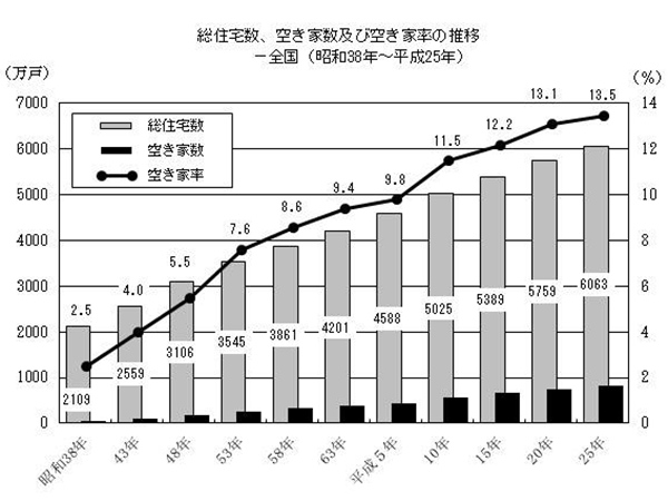 2013年に実施された土地統計調査に基づく空き家数は820万戸。5年前に比べ63万戸(8.3%)の増加で、今年(2019年)の発表では、いよいよ1,000万戸の大台に乗ることも考えられる。