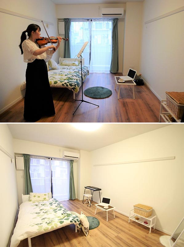 ★上)取材当日、プロのバイオリン奏者がモデルルームで演奏。玄関や隣室から音漏れをチェックしたが、ほとんど聞こえない。ちなみに「音楽マンション」で演奏OKの楽器はピアノから弦楽器、管楽器、琴や三味線まで幅広い。打楽器は不可(振動として周囲に伝わるため)★下)「サクラグラース」の居室(10帖)。両側の壁面には、付けなげしがほどこされているこのような技術を取り入れた結果、60dB(デシベル)の音を遮ることが可能になっている。