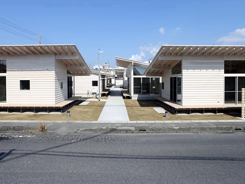 団地にしては珍しい平屋。平屋は小さな子どもをもつ世帯、高齢者、障がい者の安全に配慮した造りでもあると同時に、積層団地では生まれにくかったコミュニケーションが実現する造りでもある。