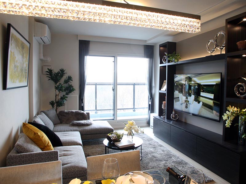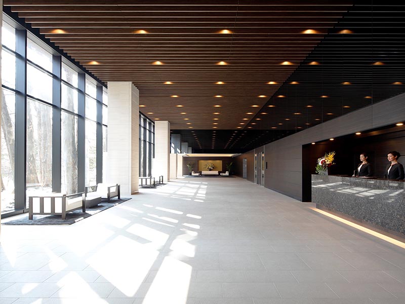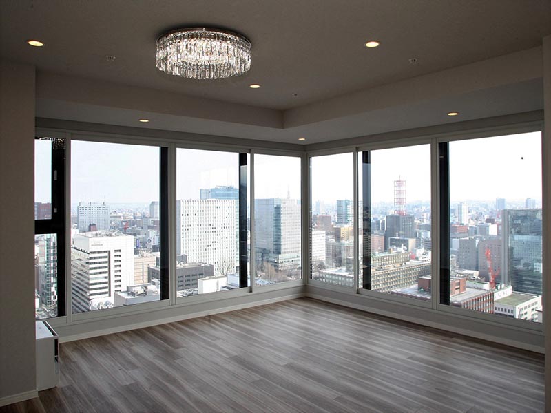 内覧会で、札幌伊藤ガーデンを見学させてもらった。ハイクラスホテルをイメージしたという風格ある車寄せを通り、天井面までガラスカーテンウオールがあるエントランスホールに入る。高さ5.3m、広さ400m2という規模で、豊かな木々がそばにそびえる。コンシェルジュが24時間常駐するフロントを右手に進むと、専有部につながるエレベーターホールに出る。各部屋はスタイリッシュな落ち着いたデザインで、間取りや広さ、賃料はさまざまだ。29階以下は2LDKが16~23万円、3LDKが21~46万円、最上階の30階は156m2で85万円(いずれも駐車場代別、管理費込み)。高層階の視界は遮るものがなく、市内の街並みや山並み、遠くは石狩湾まで見渡せる。低層階では木々に囲まれた落ち着いた雰囲気が感じられる。